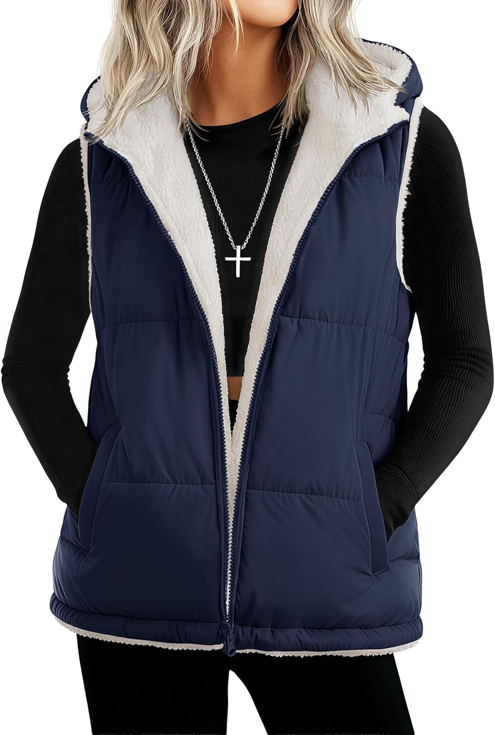 YUCOLEN Womens Puffer Vest Reversible Hooded Fleece Coat Quilted Zip Up Sleeveless Jacket Winter Outerwear with Pockets