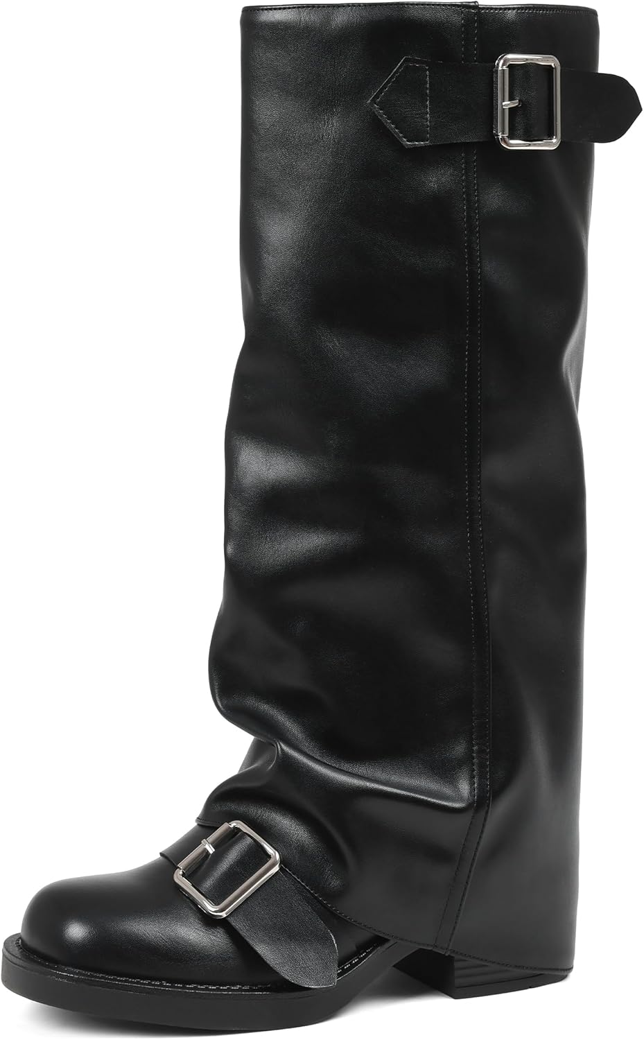 AMINUGAL Fold Over Knee High Boots Women Chunky Block Heel Festival Trendy Casual Round Toe Buckle Tall Slouchy Boots for Women Motorcycle Riding Rave Club Pull on Y2K Long boots