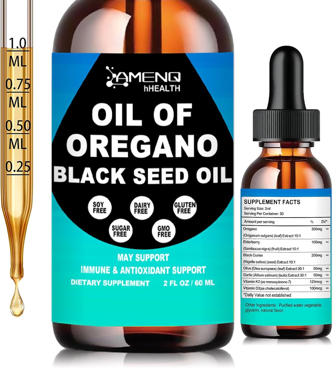 - 🌱7-IN-1 HERBAL BLEND: Crafted with wild oregano oil(aceite de oregano), Elderberry, Black Seed Oil, Olive, Garlic and vitamin D3 & K2, this oregano oil with black seed oil is designed for those who want natural daily support. This oregano oil drops specifically helps strengthen the immune system, promote maintain clear breathing during seasonal changes, and support balanced digestion after meals*