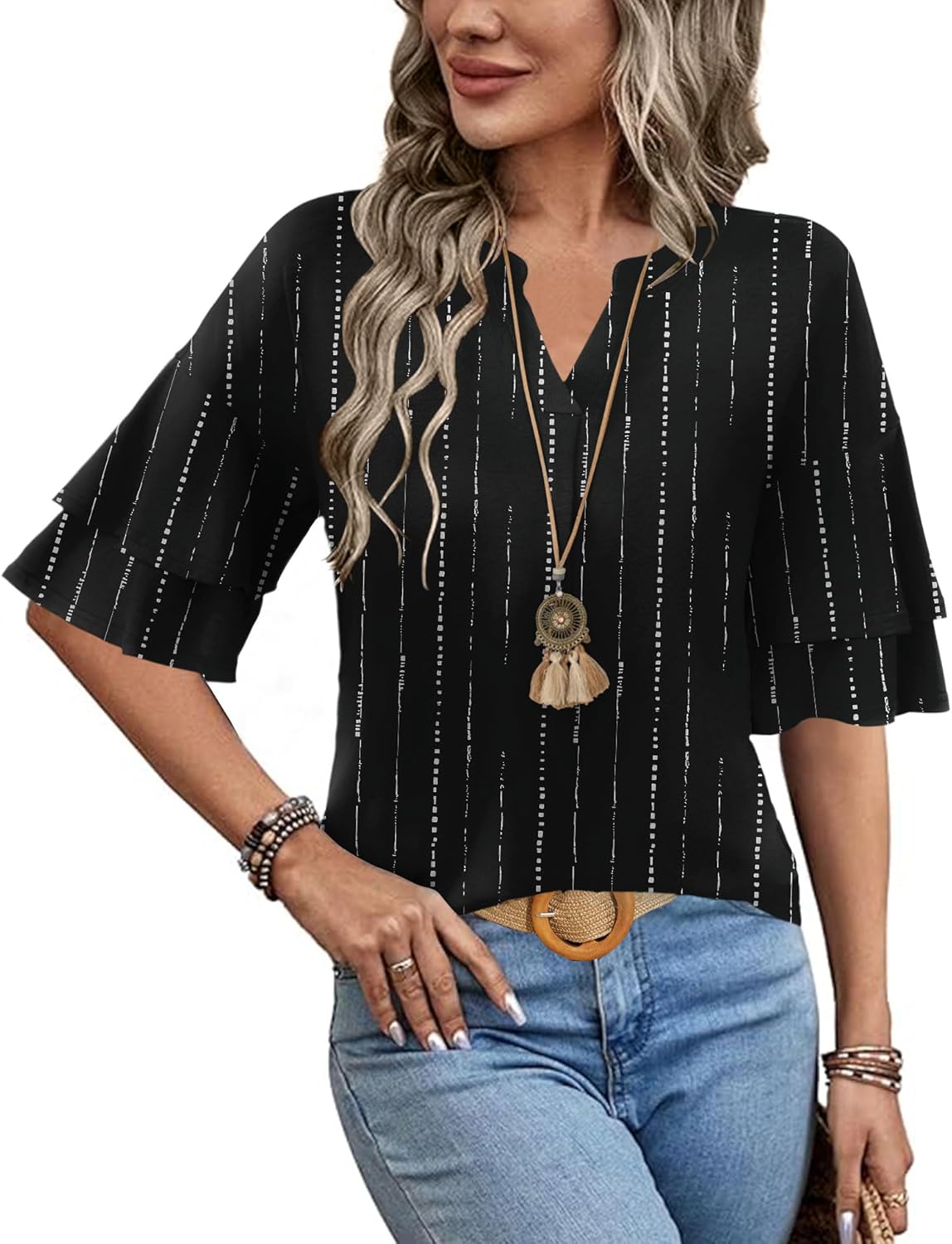 LOMON Womens Tops Ruffle Short Sleeve Blouses Fashion V Neck T Shirts Dressy Casual 3/4 Bell Sleeve Tee Spring Summer Clothes