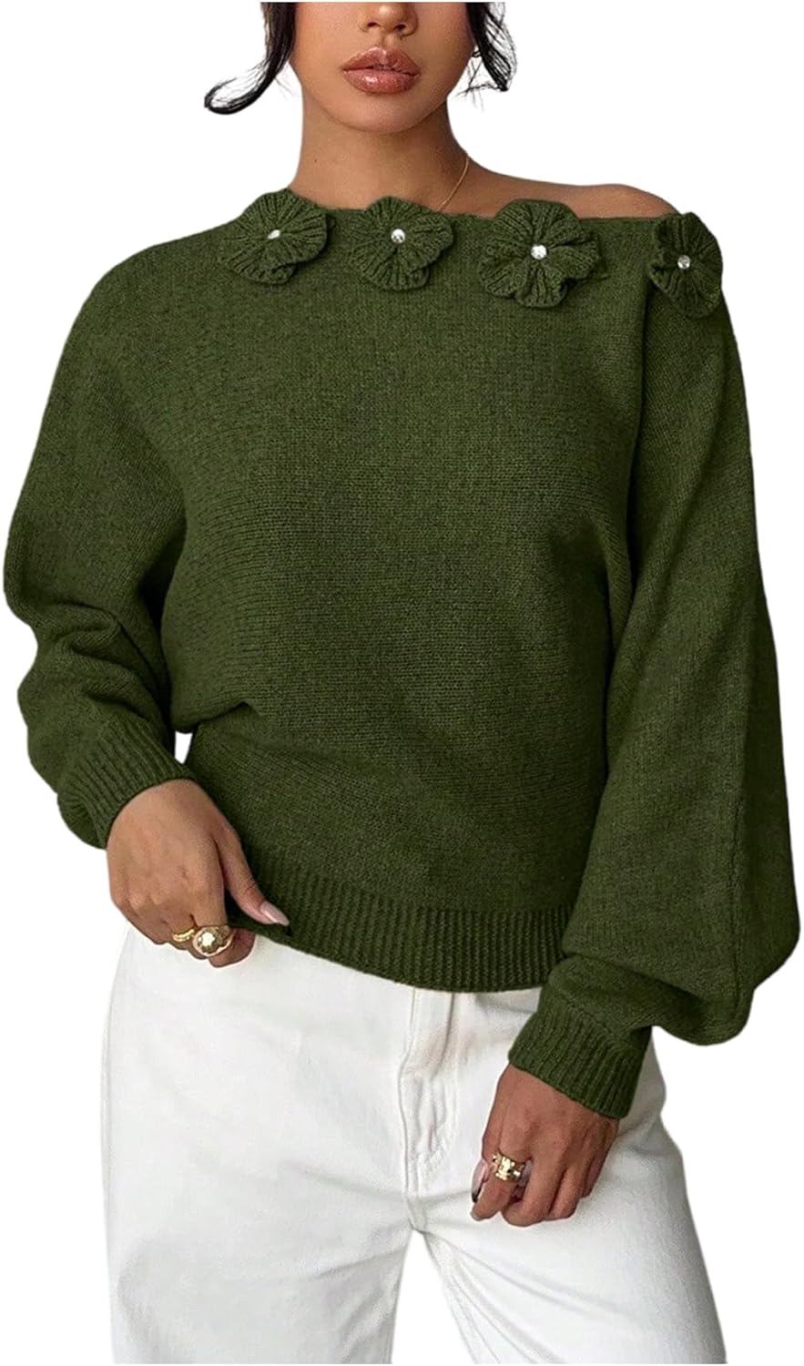 Women's 3D Floral Off The Shoulder Sweater Long Sleeve Elegant Knit Tops Fall Pullovers