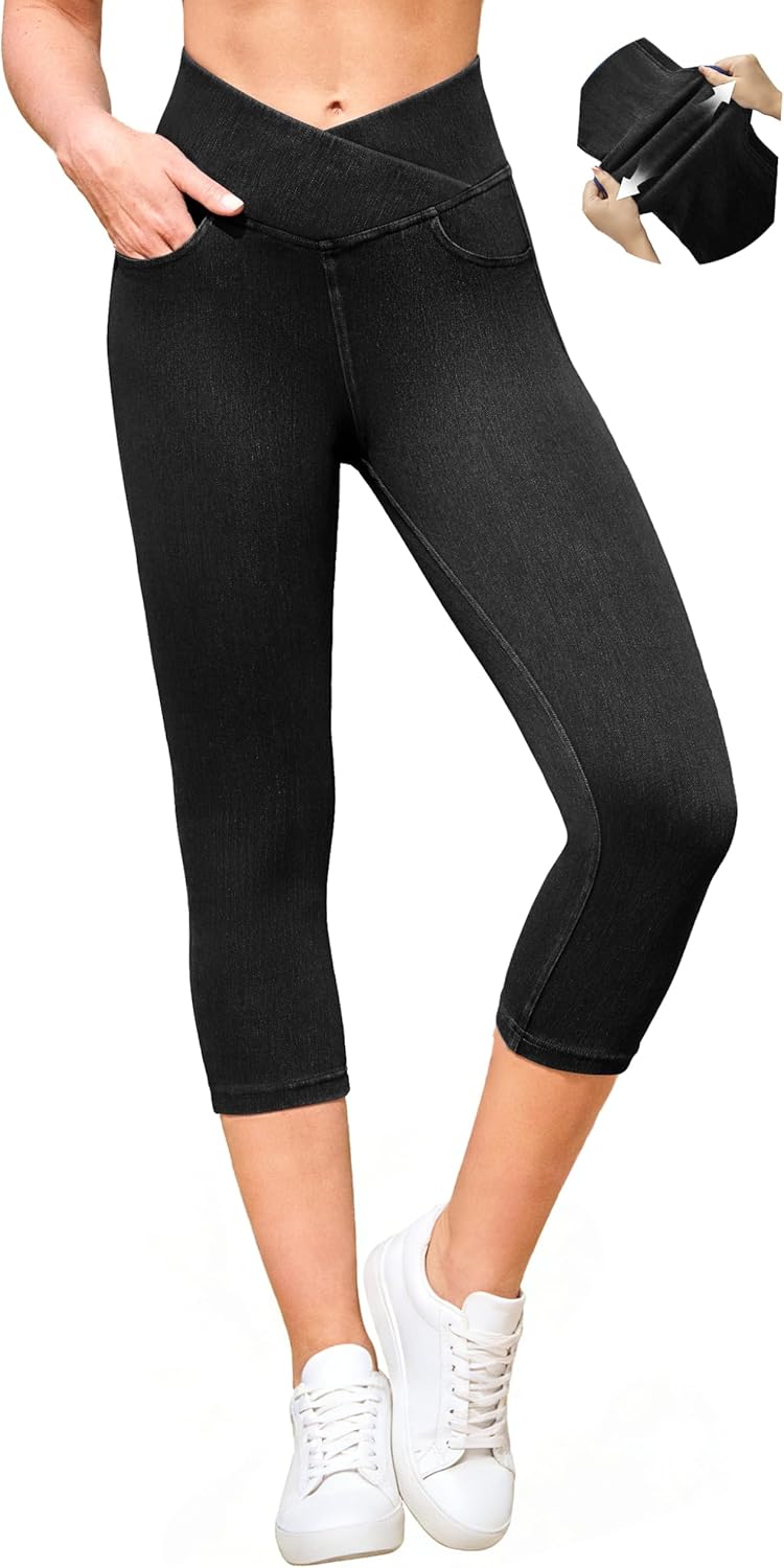 IUGA Stretchy Capri Jeans for Women Pull On Jeggings Tummy Control Jean Capris Pants Capri Leggings for Women with Pockets