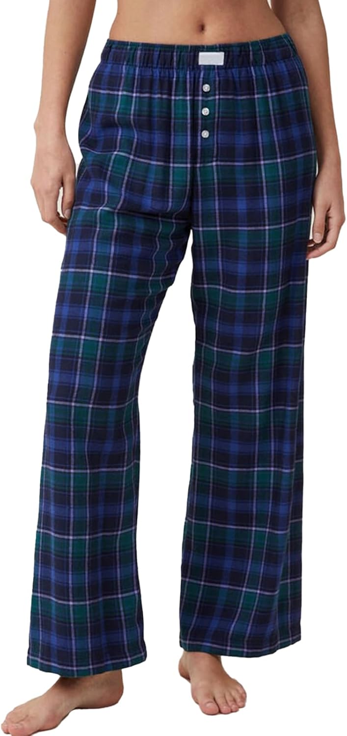 Womens Casual Plaid Straight Wide Leg Pants Elastic Waist Sweatpants Button Workout Pants Lounge Trousers with Pockets