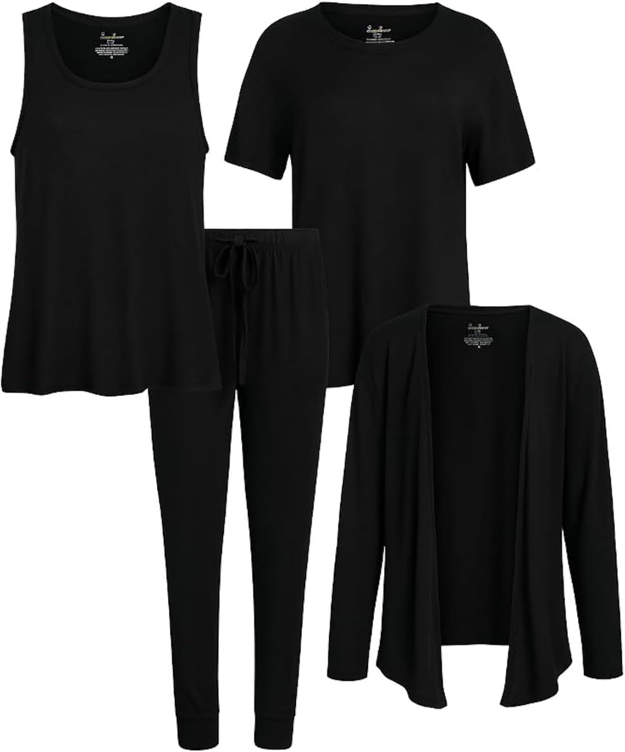 Women's 4-Piece Pajama Set, Soft Hacci Knit Loungewear, Short Sleeve T-Shirt, Tank Top, Cardigan & Jogger Pants