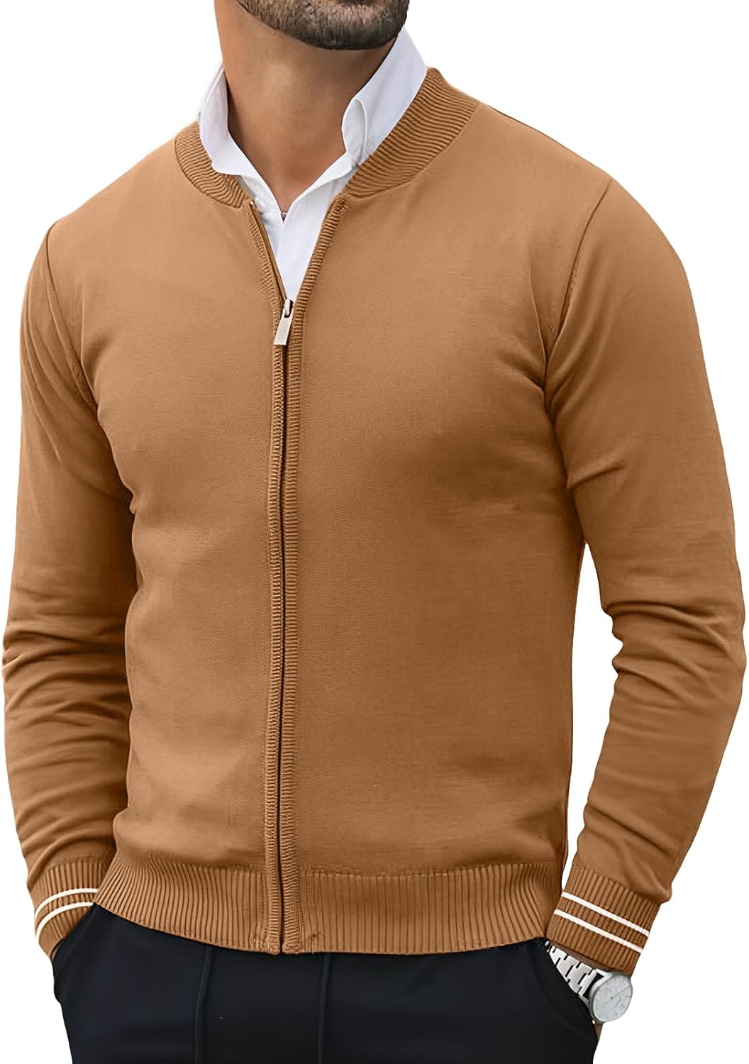 Lexiart Men's Casual Cardigan Sweaters Knitted Stand Collar Slim Fit Full-Zip Warm Jacket