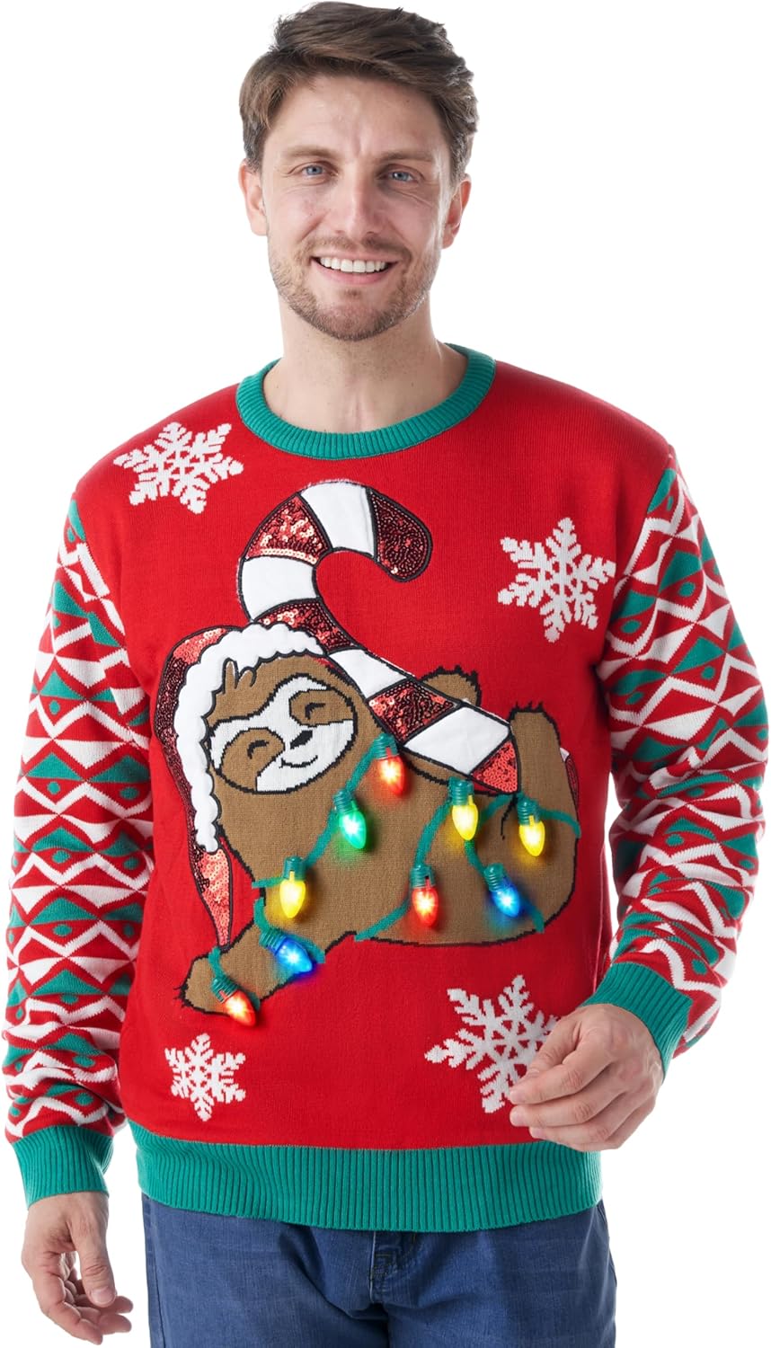 Giggling Getup Ugly Christmas Sweater with Light, LED Ugly Christmas Sweater for Women Men Kids 2025 Sloth Bear(Red)