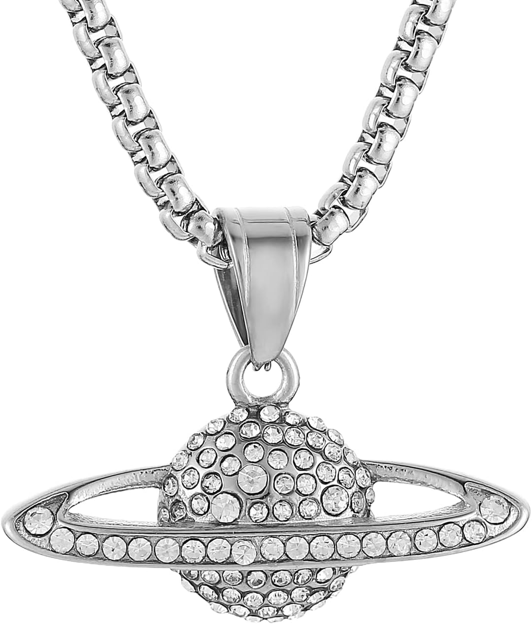 STWTR Saturn Necklace for Men Women Stainless Steel Cubic Zirconia Planet Necklace Pendant Jewelry Gift