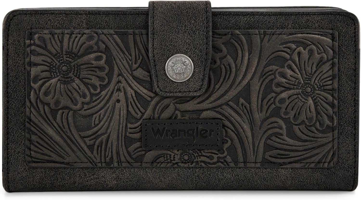 - Wrangler wallet features exquisite tooling flower design. Blending western and elegant styles, which complements your outfits perfectly.