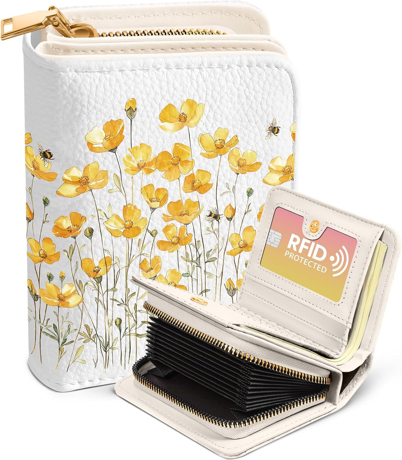 Bistup Credit Card Holder Wallet for Women - Cute Leather Ladies Teen Girls Female Cardholder Wallets Accordion Purse Small Medium Aesthetic Yellow Flower Unique Modern Rfid Zipper Around