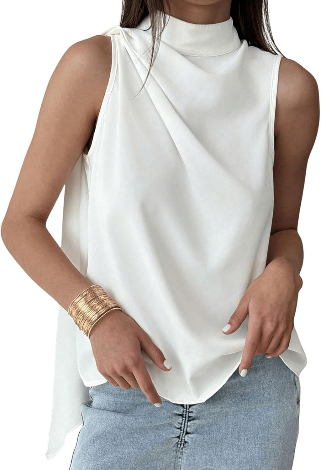 Cicy Bell Womens Mock Neck Satin Tank Tops Business Casual Work Ruched Blouses Summer Corporate Outfits
