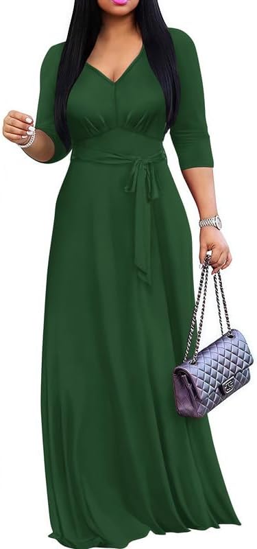 Maxi Dress for Women 3/4 Sleeves V-Neck Semi Formal Church Long Casual Dresses with Pockets