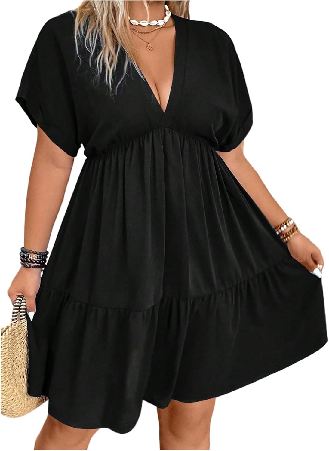 SOLY HUX Women's Plus Size Dresses Deep V Neck Short Sleeve Swing Flowy Summer Vacation Short Dress