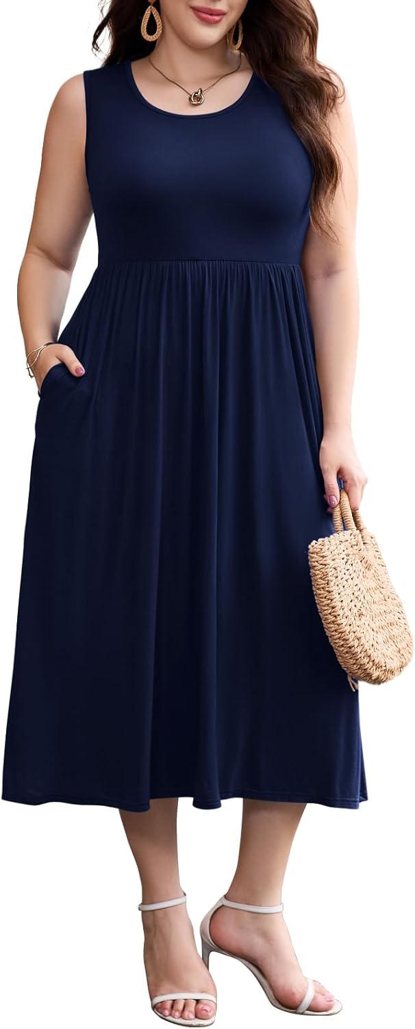 LARACE Women's Plus Size Sleeveless Maxi Dress Casual Crew Neck Pleated Flowy Long Dresses with Pockets L-6XL