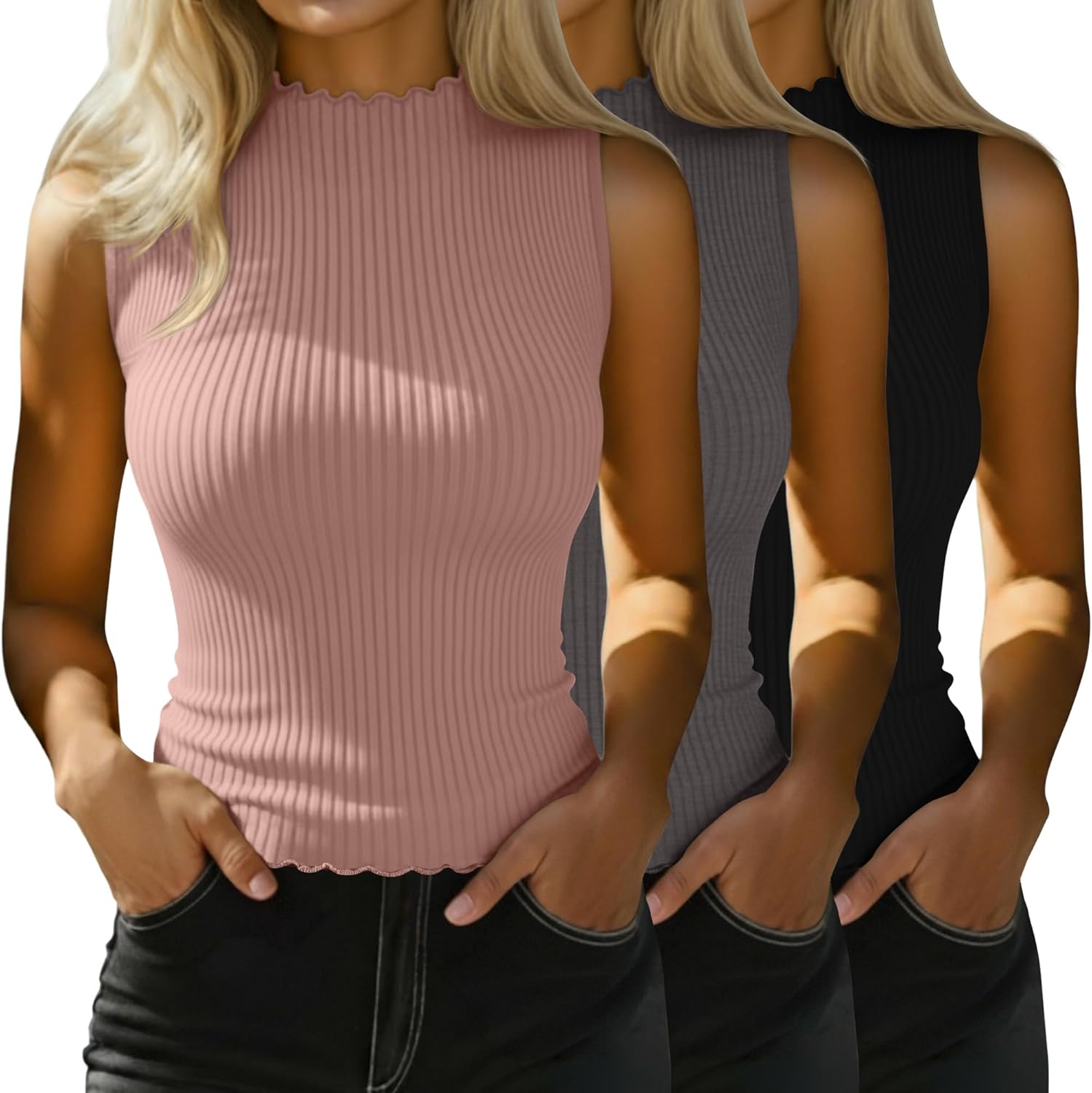 Riyiper 3 Pack Women's Sleeveless Mock Turtlenecks Shirts Lettuce Trim Ribbed Knit Slim Summer Casual Tank Tops Basic Tees