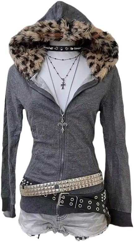 Pooyikoi Women Y2K Zip Up Hoodie Gothic Graphic Emo Grunge Jacket 90s Fur Hoodie Punk Streetwear Aesthetic Clothes