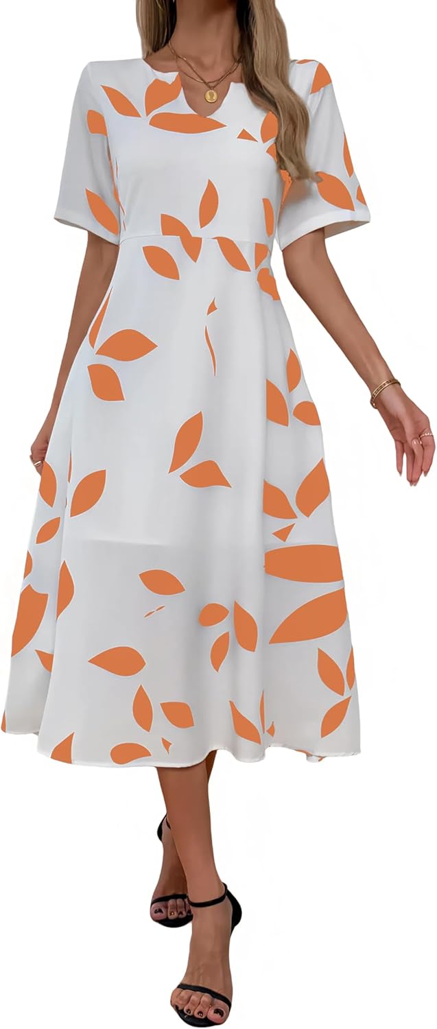 Women's Summer Midi Dress Short Sleeve Sweetheart Neck Leaf Print Loose Dress with Pockets