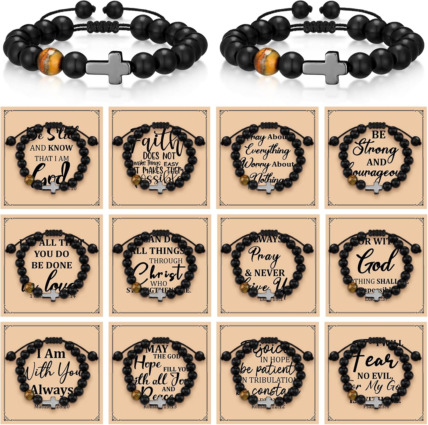 - Cross Bracelet Set: our package includes 12 religious cross bracelets and 12 inspirational bible verse cards and 12 envelopes, the cross is a very classic exquisite religious symbol, natural gemstones combined with the classic cross represent your pure faith; Wear this religious cross bracelet to express faith, suitable for your daily use; Or as a gift to your friends