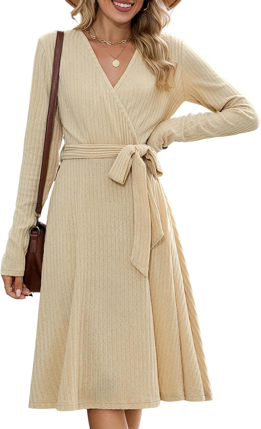 ZAFUL Women's 2025 Casual V Neck Long Sleeve Sweater Dress Wrap Ribbed Knit Pleated Midi Dresses with Belt