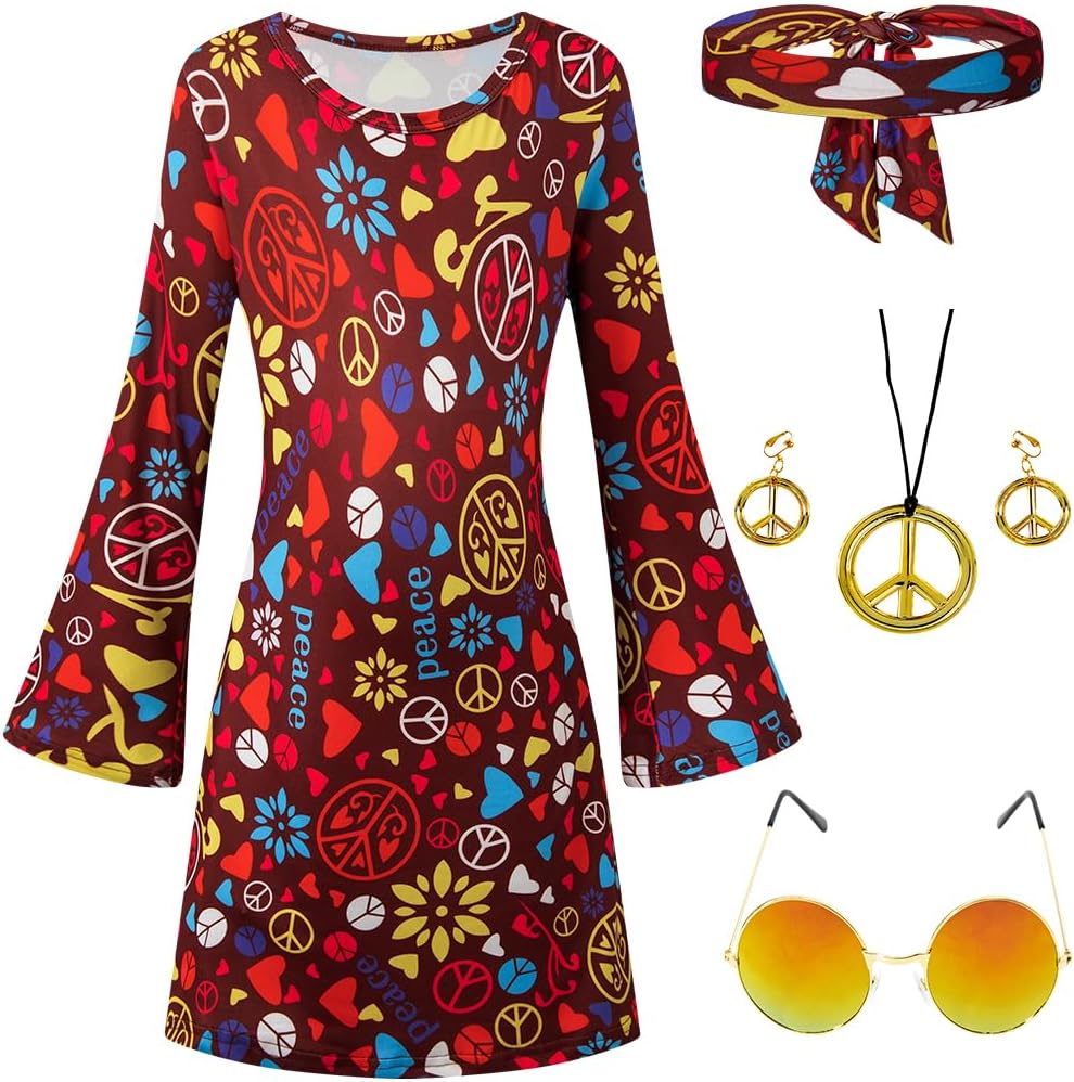 Girls Kids 60s 70s Hippie Costume Dresses Disco Outfits Party Clothes with Necklace Earrings Sunglass