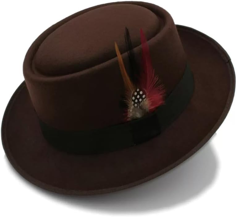Classic Pork Pie Hat with Feathers Flat Top Fedora, Vintage Panama Hats, Warm Comfortable Jazz Cap