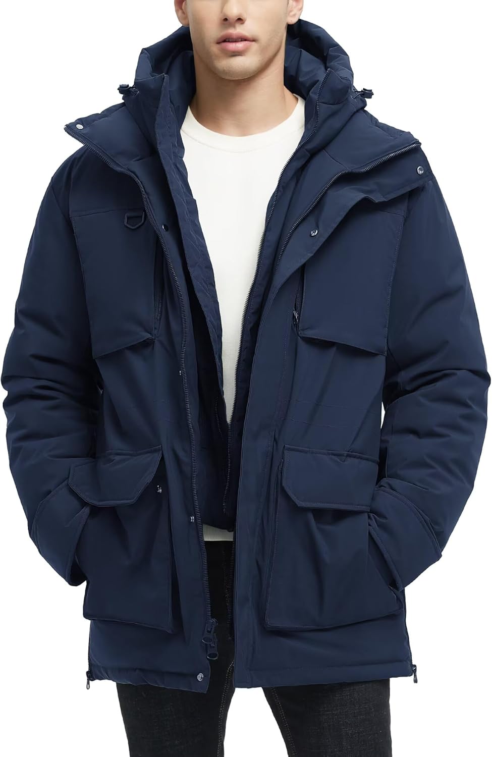 Rejork Long Winter Jackets for Men Faux Two-Piece Waterproof Parka Snow Warm Coats with Hood