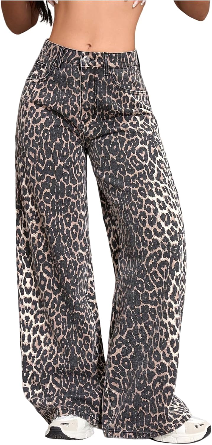 WDIRARA Women's Leopard Baggy Jeans Y2k Wide Leg Denim Pants Streetwear