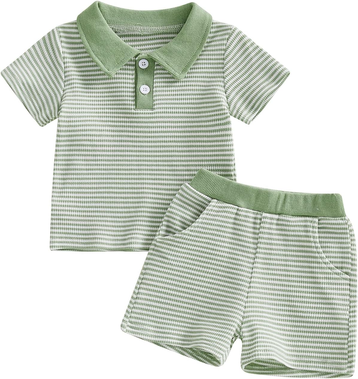 VISGOGO Baby Boy Summer Outfit Striped Short Sleeve T-shirt Toddler Boy Summer Clothes 6 12 18 Months 2 3 4 T Short Set