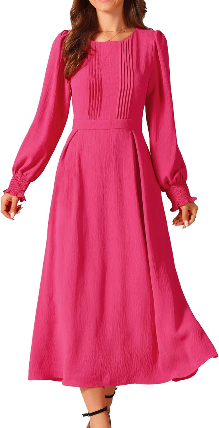 Seta T Women's Elegant Frilled Crewneck Midi Dress Long Sleeve Pleated A-Line Flowy Casual Dresses with Pockets, Medium