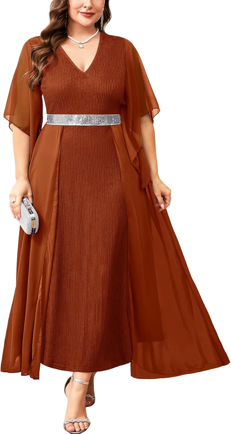 ZOMVA Plus Size Formal Dress V Neck Chiffon Handkerchief Sleeve Mother of Bride Dresses Wedding Guest Party Evening Gown