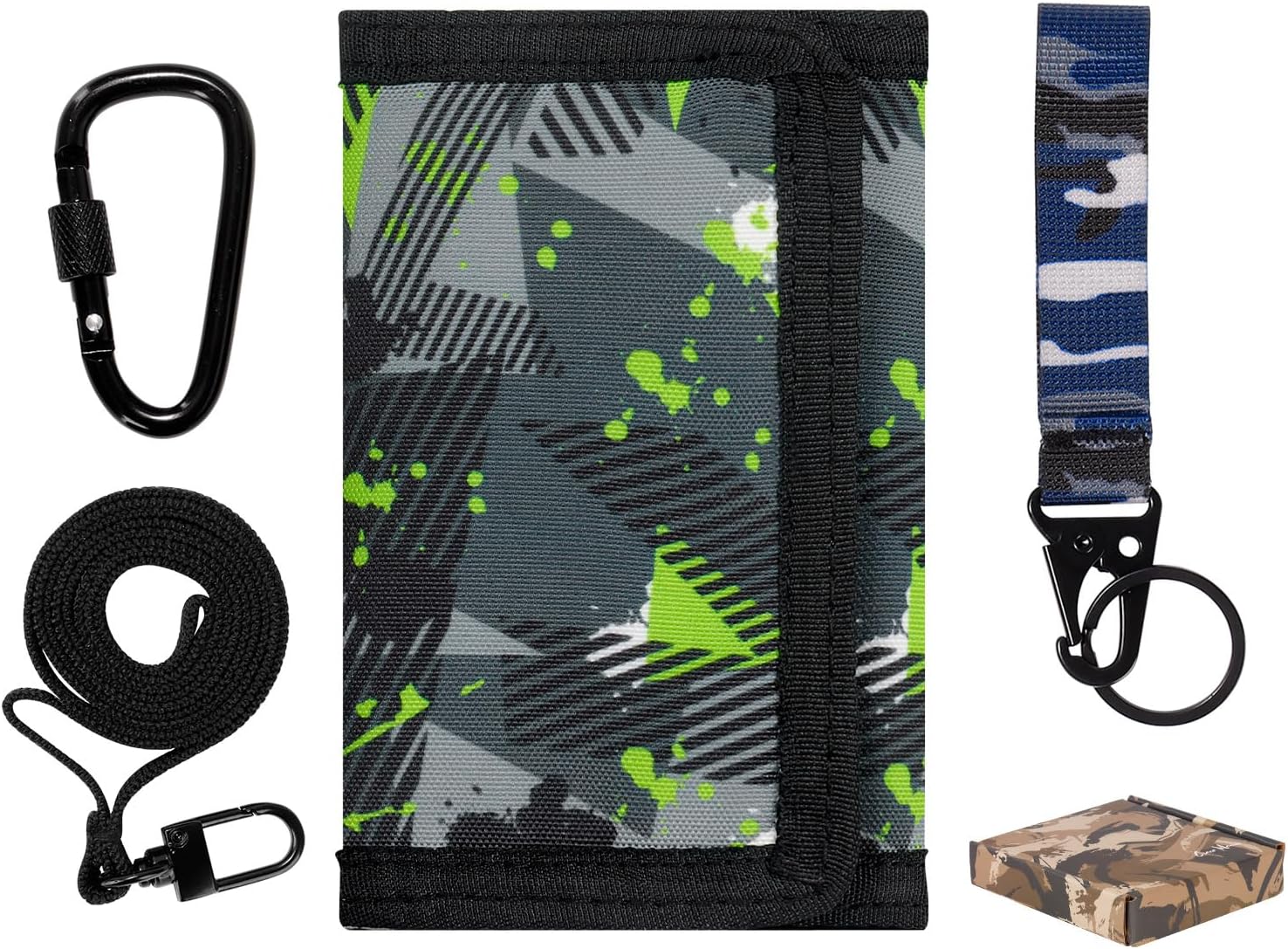 Choco Mocha Boys Wallet for Kids, Wallet for Teen Boys with Lanyard Gift Box Camo Trifold Wallets with Coin Zipper Teen Boy Gift - Birthday Gift for 8 9 10 11 12 13 14 Year old Boy, Fluorescent Green
