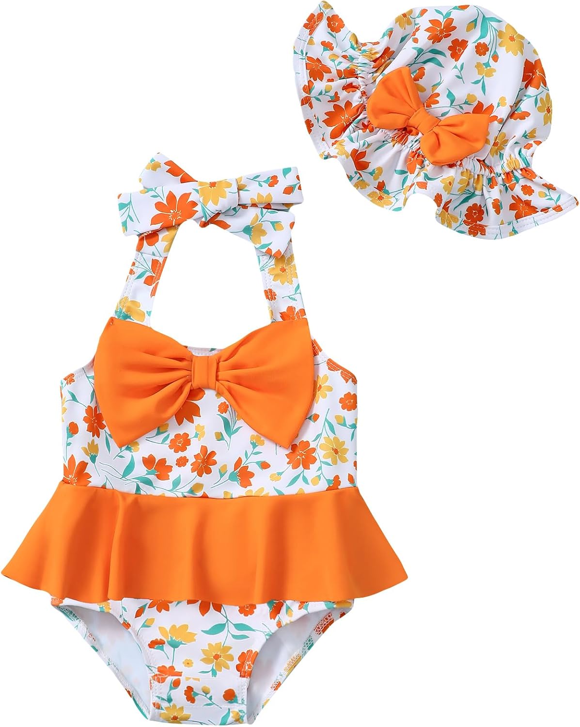 Kucnuzki Baby Girl Swimsuit Newborn One Piece Bathing Suit Bow Tie Bikini Tankini Infant Swimwear with Hat