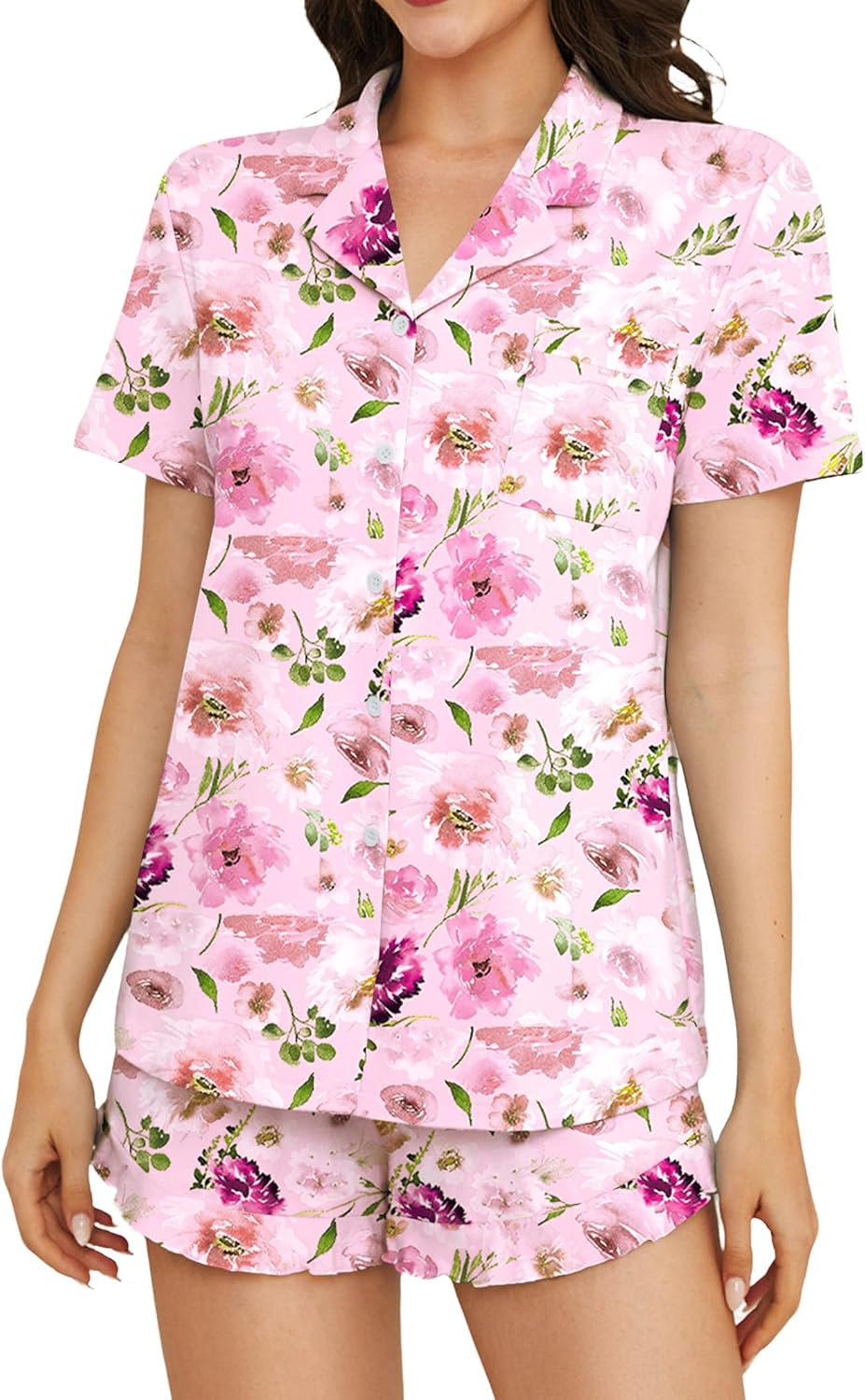 Marvmys Women Short Sleeve Pajamas Set Button Down 2 Piece Pjs Shorts Set Ruffle Lounge Set Sleepwears S-XXL