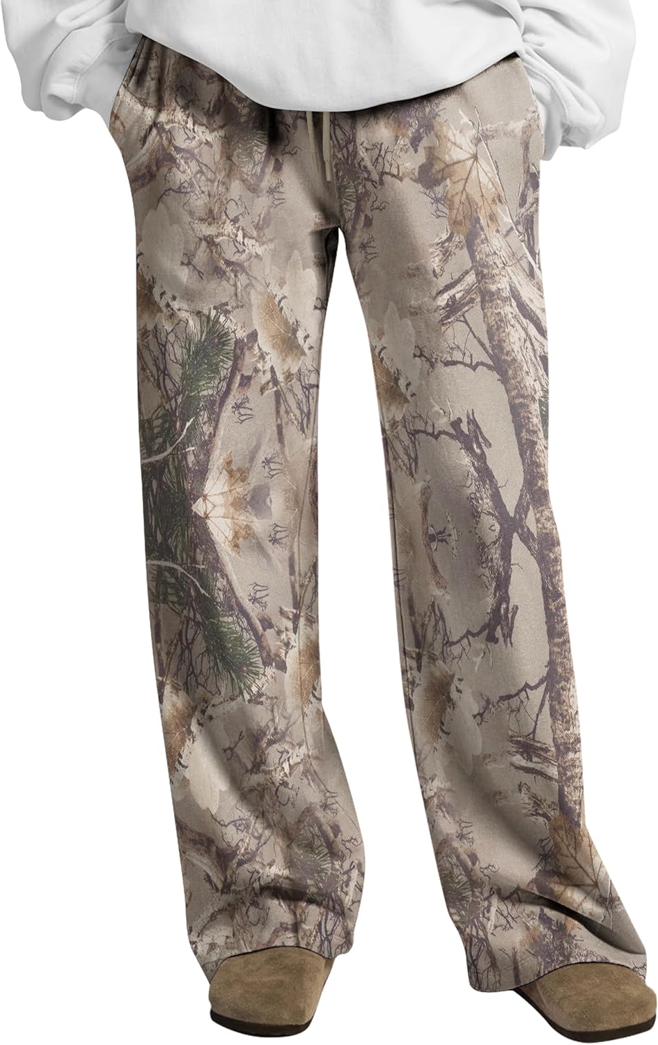Women Wide Leg Camo Sweatpants Drawstring High Waisted Camouflage Sweat Pants Baggy Fleece Camo Pants with Pockets