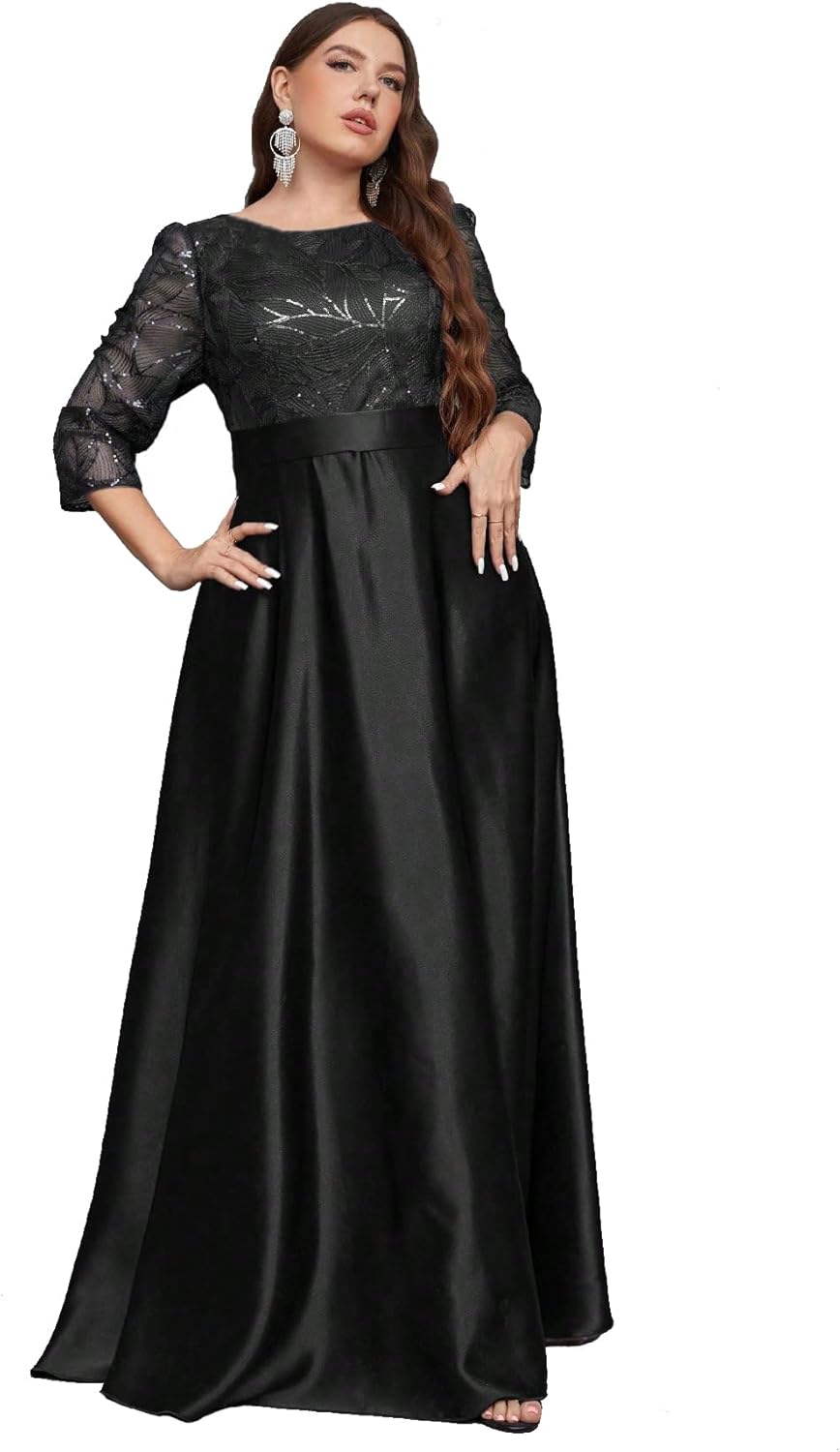 Women's Plus Size Sequin Embellished with Satin A-line Hem 3/4 Sleeves Formal Evening Gown Maxi Long Dress