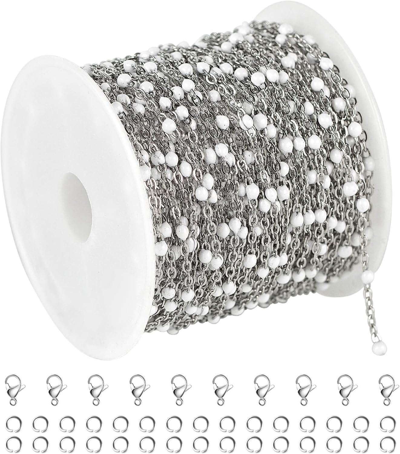 - JEWELRY CHAIN SET: 33 Feet(10m) white enamel beaded chain for jewelry making with 10pcs lobster clasps + 30pcs open jump rings. It is convenient to use these jewelry supplies together with the rosary bead chain for your bracelet necklace crafting.