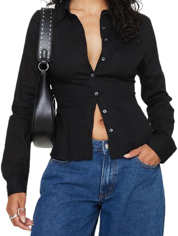 Women Long Sleeve Button Down Shirt Y2K Lapel Collar Slim Fit Cropped Blouse Coquette Plaid Going Out Tops