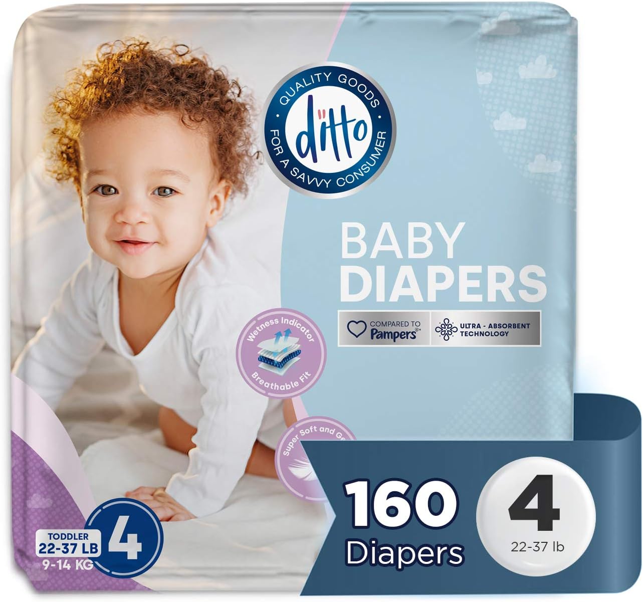 Ditto Baby Diapers Size 4 (160 Count) – Breathable Disposable Diapers – 12-Hour Leak Protection & Wetness Indicator – Day + Overnight Diapers for Sensitive Skin – No Fragrance, Parabens or Latex