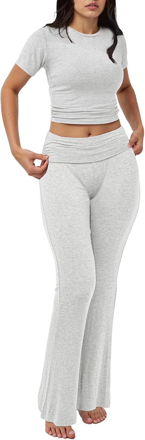 Motarto Women's 2 Piece Lounge Sets Short Sleeve Slim Fit Foldover Flare Pants Crop Top Casual Loungewear PJ