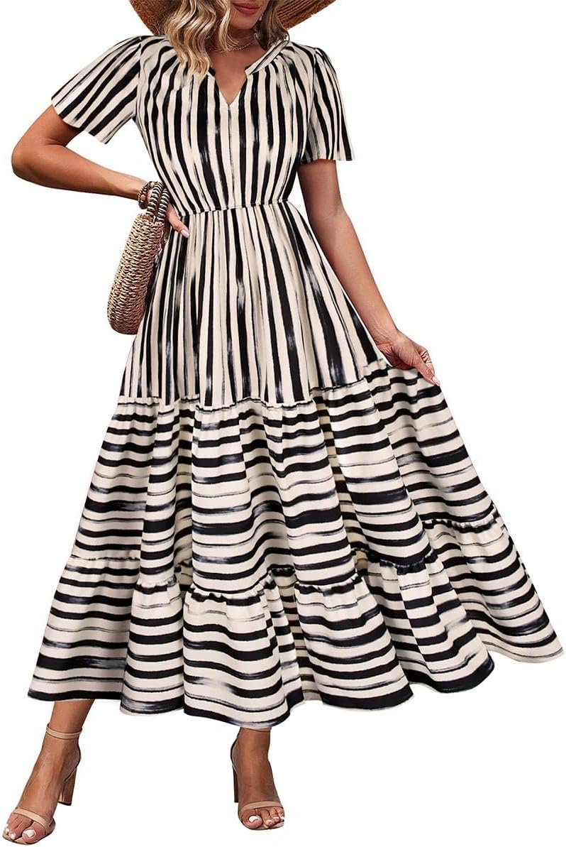 TIYOMI Women Plus Size Dress Boho V Neck Short Sleeve Beach Maxi Dresses Floral/Stripe/Leaves/Lemon XL-5XL