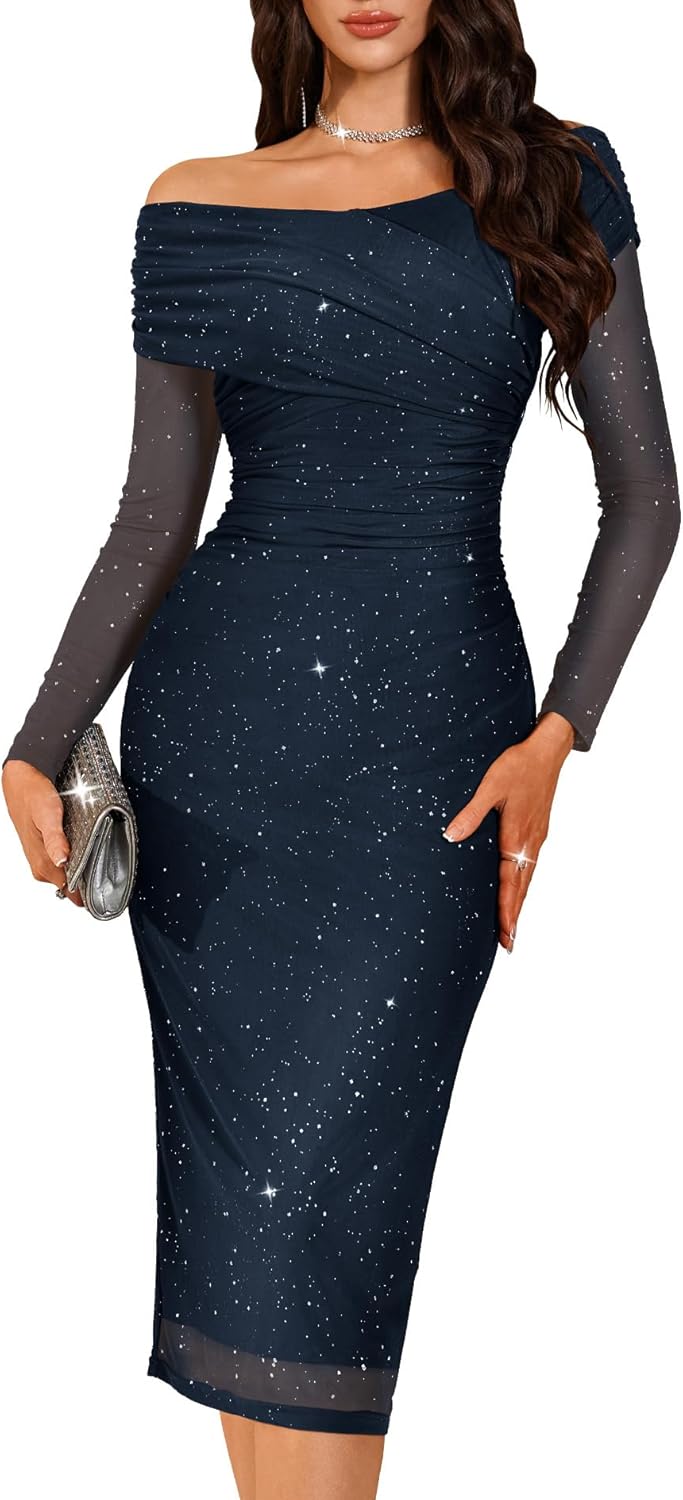 BeryLove Sparkly Off Shoulder Formal Wedding Guest Dresses Long Sleeve Midi Cocktail 2026 Sequin Mesh Evening Gala Gown Glitter Prom Party Sheer Baby Shower Dress Navy L