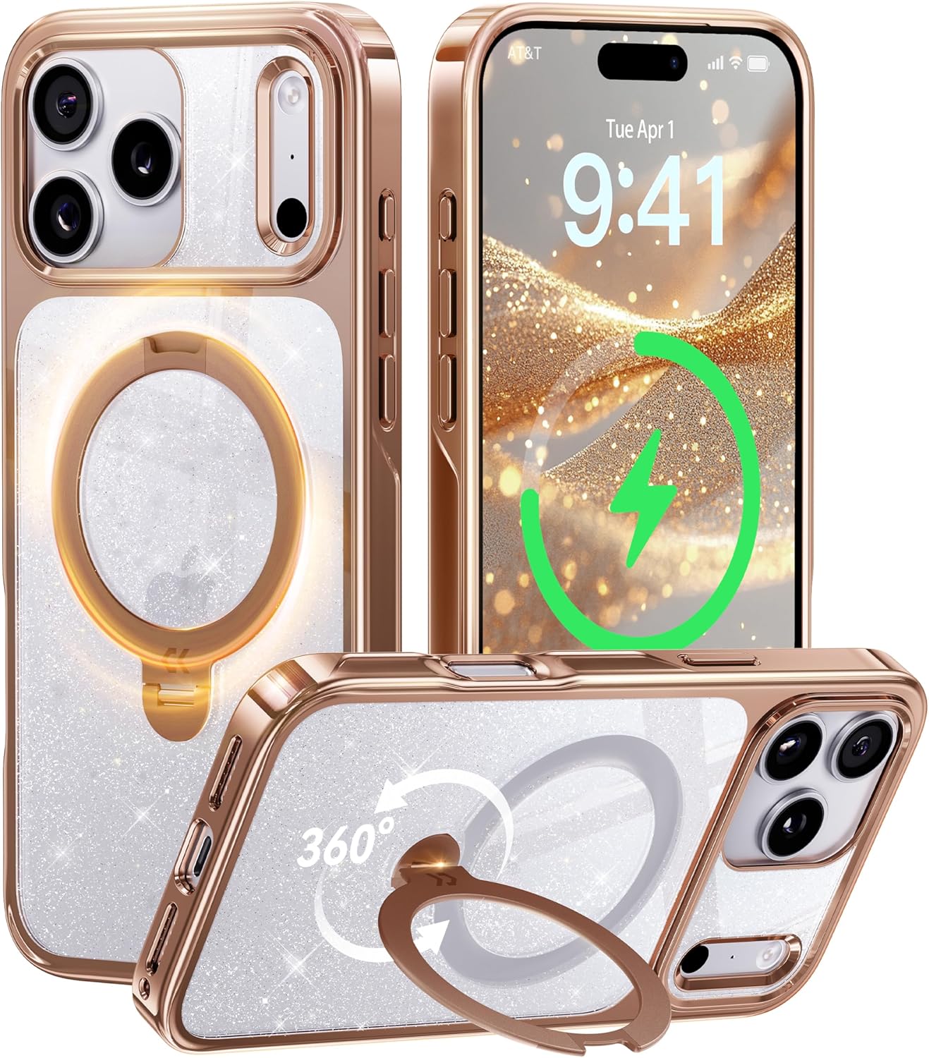 CASEKOO Rose Gold Pearl Sparkle 360 Spin Magnetic Stand for Glossy iPhone 17 Pro Case for Women, Fit for MagSafe, 17FT Drop Protection, Chic Design for 17 Pro Case with Stand, Sparkle Rose Gold