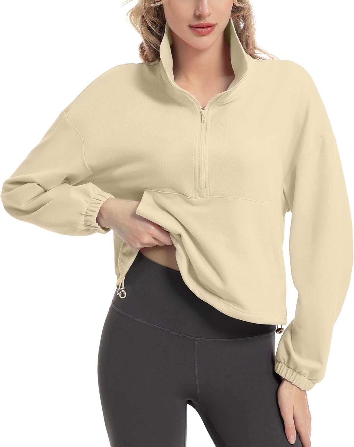 FKEEP Quarter Zip Pullover Women Cropped Sweatshirt Long Sleeve Crop Top Stand Collar Drawstring Casual Pullover