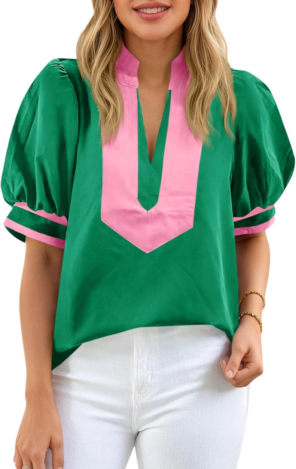 Cicy Bell Womens Color Block Puff Sleeve Blouses Summer Casual Dressy V Neck Tops Loose Fit Tee Shirts