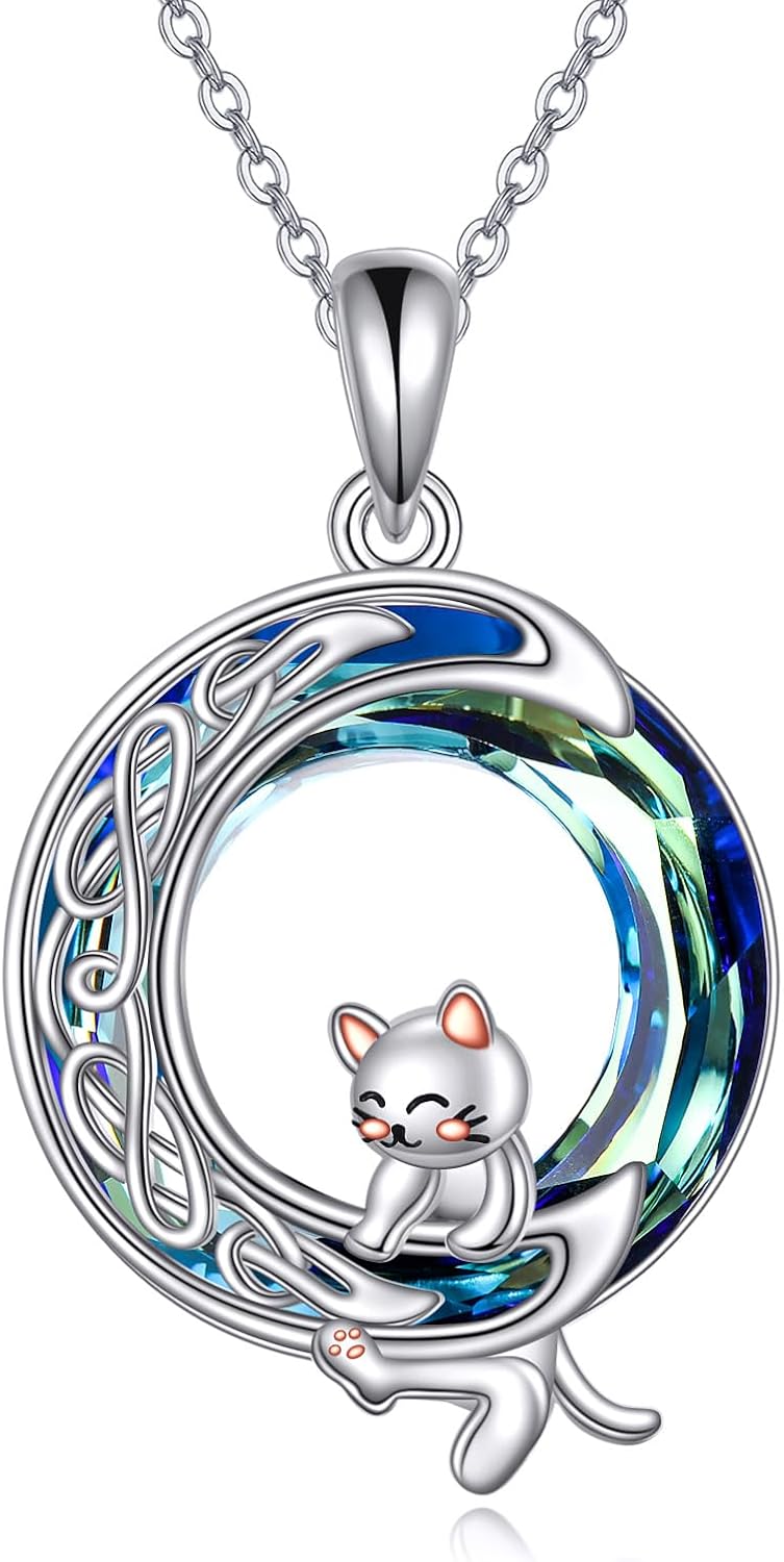 VONALA Cat Necklace for Women 925 Sterling Silver Moon Pendant with Crystal Cat Jewelry Gifts for Animal Lovers