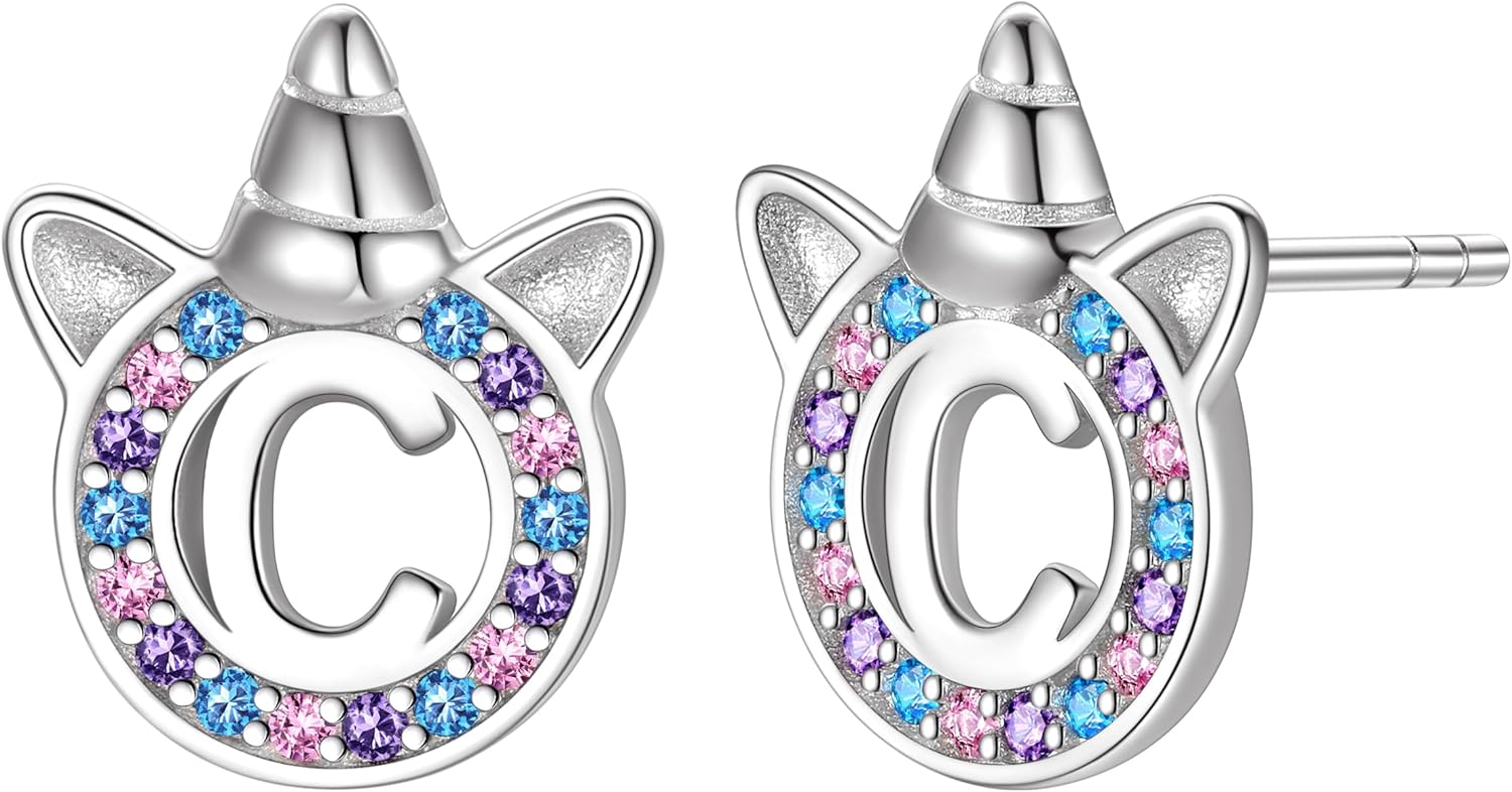 Unicorn Initial Earrings for Girls Women, 925 Sterling Silver Alphabet Stud, Ideal Initial Letter Stud Earrings Birthday Gifts for Girls Women