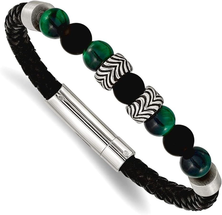 JewelryWeb 5.6mm Stainless Steel Oxidized and Polished Black Agate And Green Tigers Eye Beads Black Leather Bracelet 8.5 Inch Link Bracelet for Women
