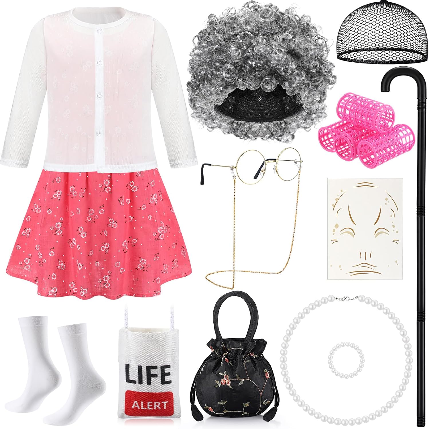 12 Pcs Halloween Old Lady Costume for 100 Days of Costume Granny Outfit Granny Dress Wig with Accessories for Parties Cosplay