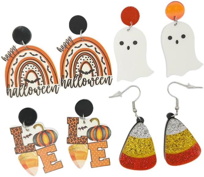 Halloween Earrings Set for Women Glitter Acrylic Cute Ghost Pumpkin Bats Dangle Stud Earrings Halloween Holiday Costumes Easter Party Jewelry Gifts-4 Pairs