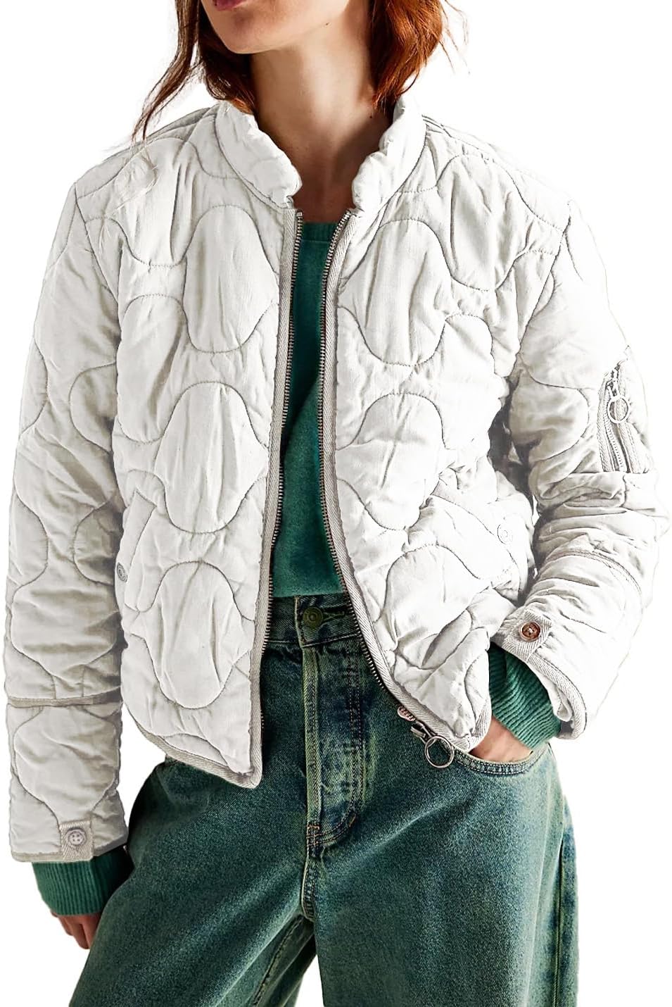 Flygo Women Lightweight Quilted Jackets Oversized Long Sleeve Zip Cropped Puffer Padded Coat Fall Winter Jacket