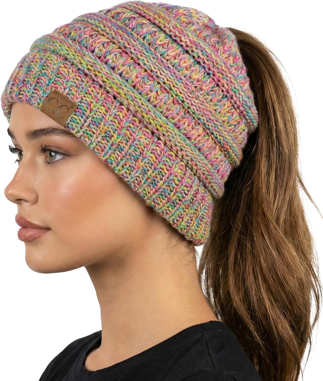 Funky Junque Ponytail Beanie for Women - Winter Ponyback Hat Soft Stretch Cable Knit High Pony Tail Womens Running Hats
